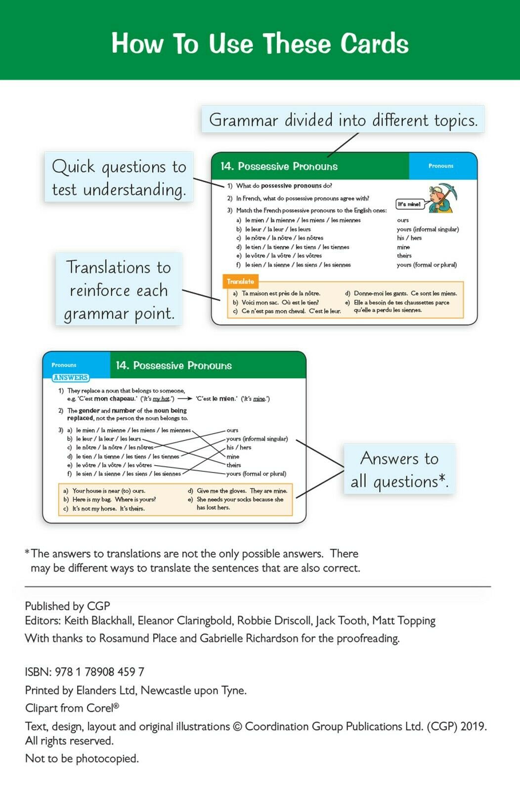 It's time to put your Grade 9-1 AQA GCSE French Grammar & Translation knowledge to the test with our unmissable Question Cards! The 79 cards use a range of question types to test all the grammar points you'll need to know, as well as giving you a chance to practise your translation skills. The cards are helpfully split up into topics for focussed revision. Flip the card over and you'll find answers to each question.